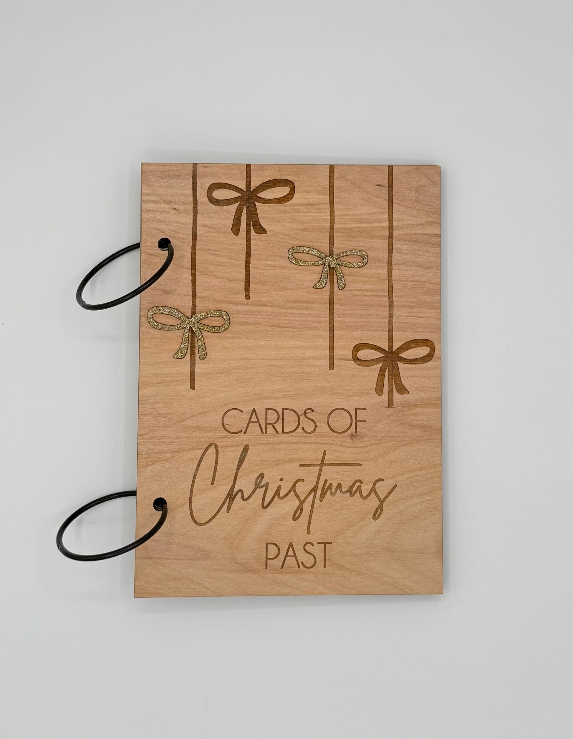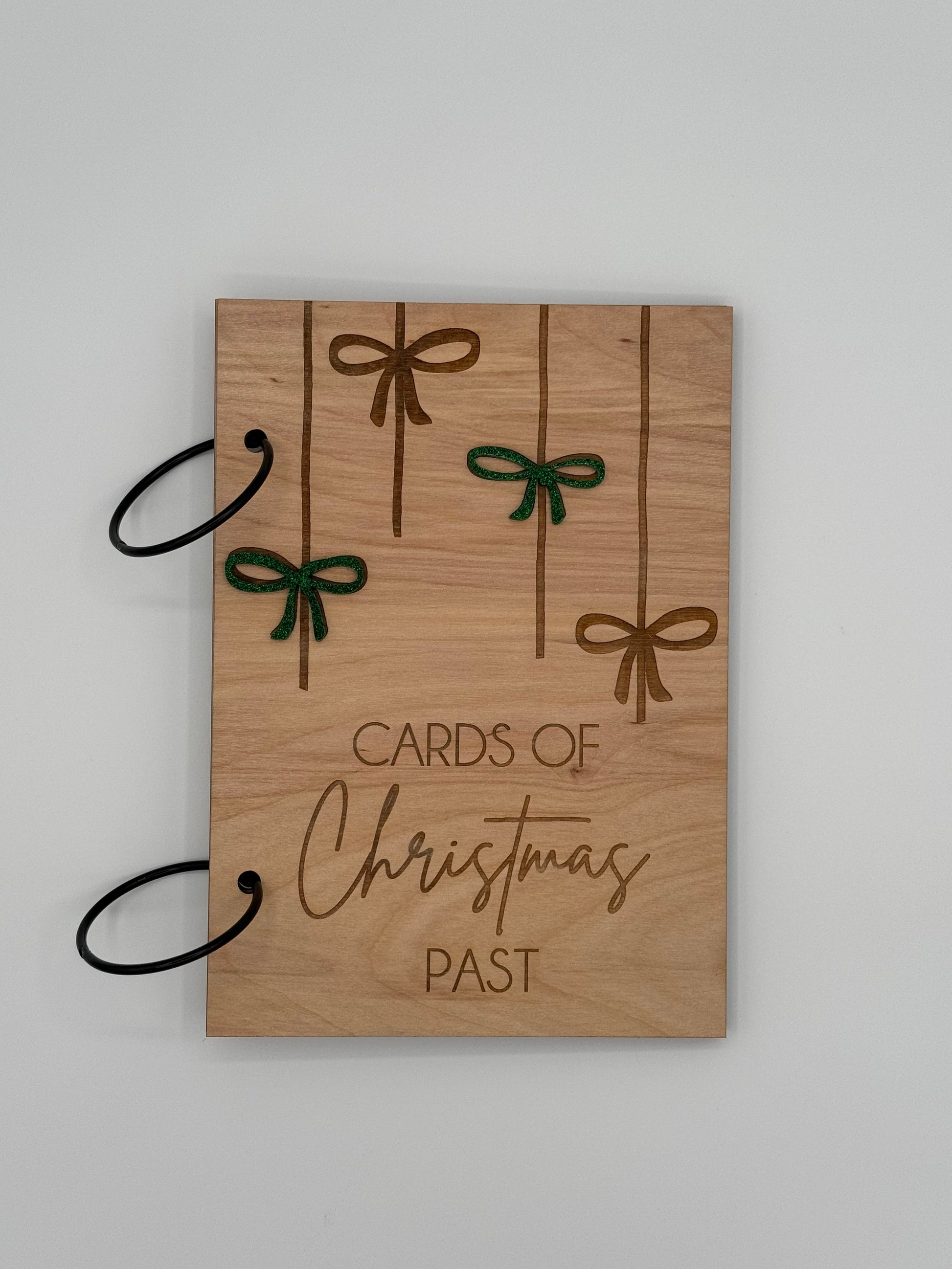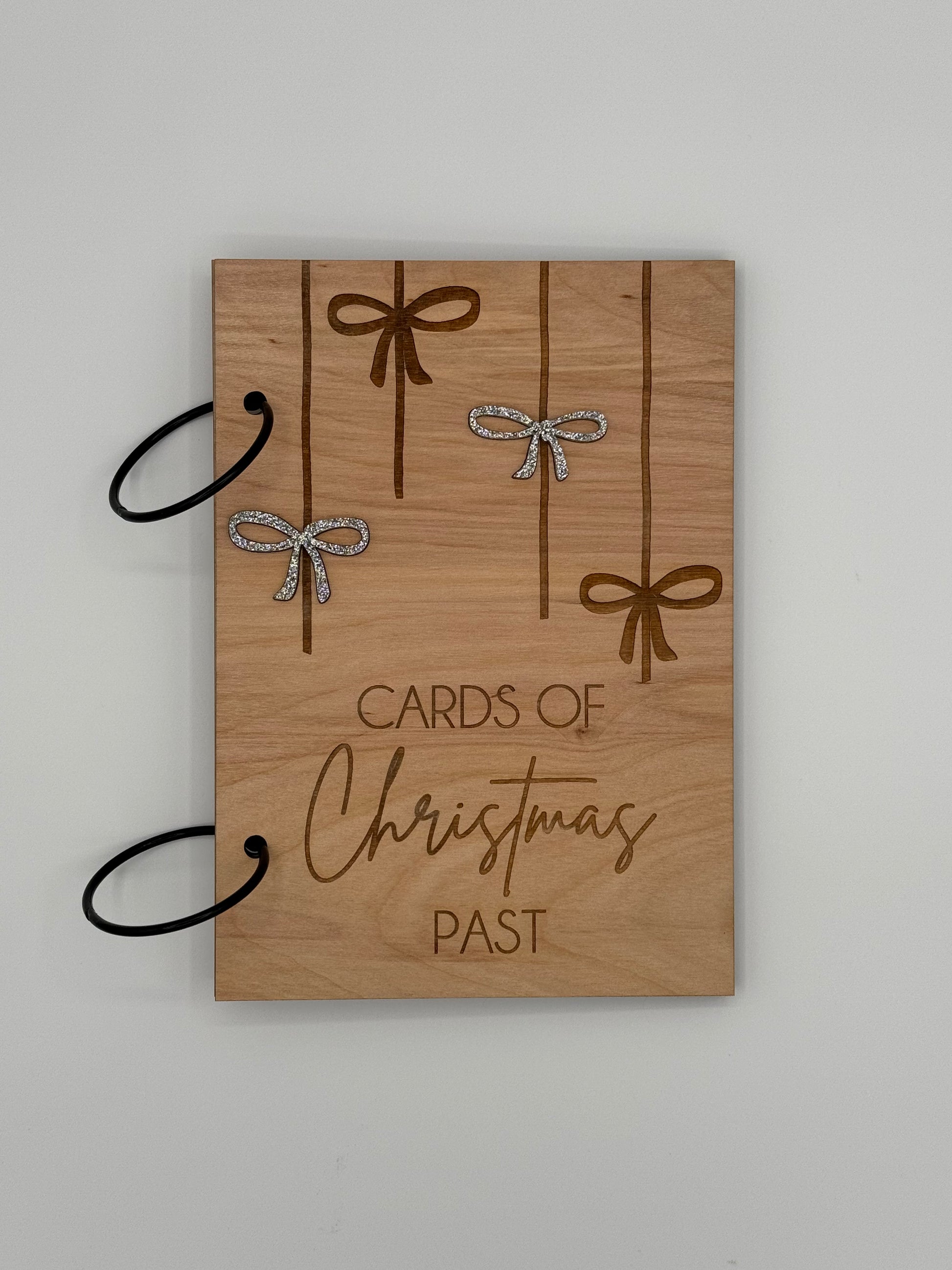 š Engraved Cards of Christmas Past on birch wood with four sweet bows ā two engraved and two layered in your choice of shimmering acrylic:
