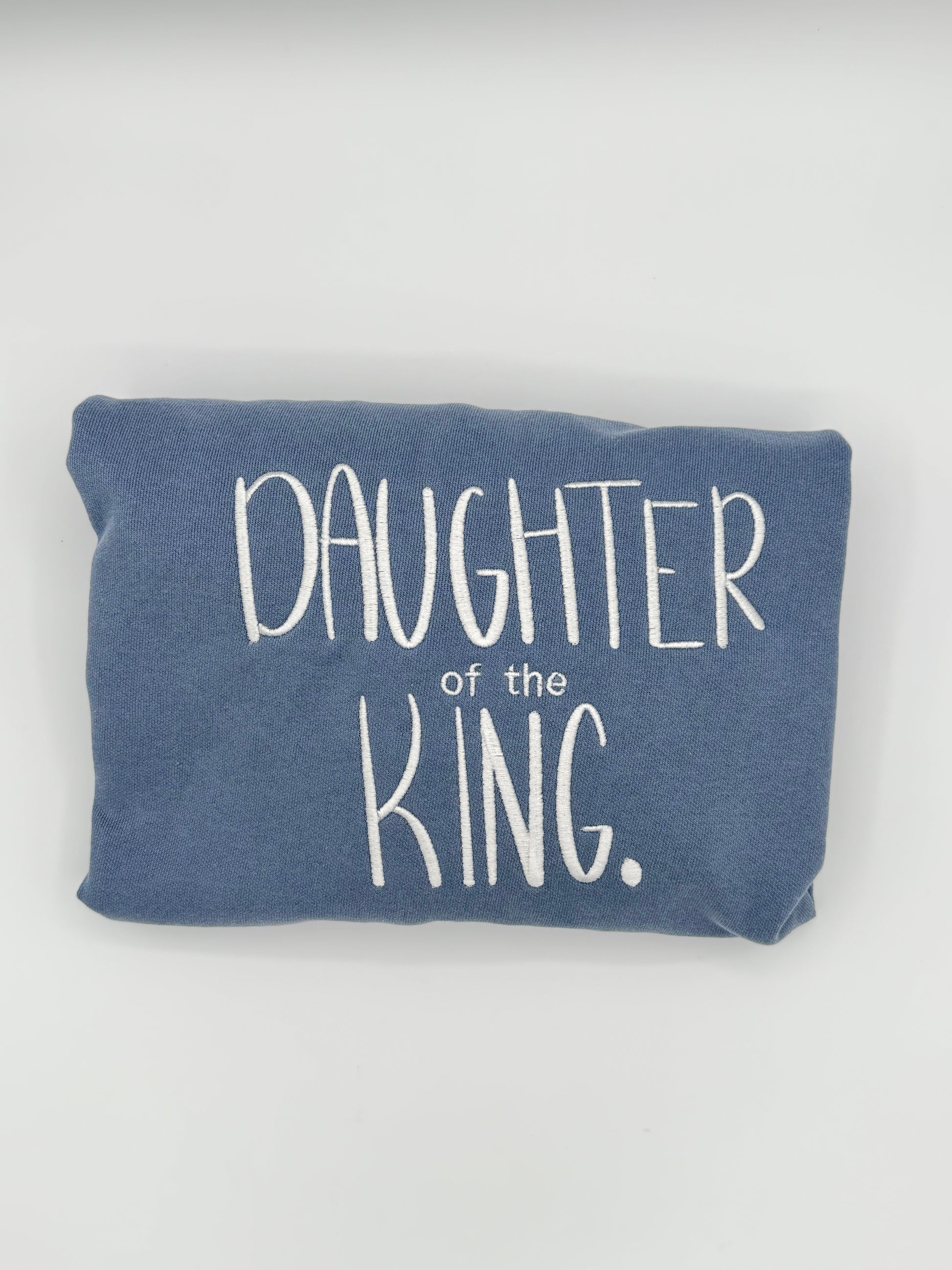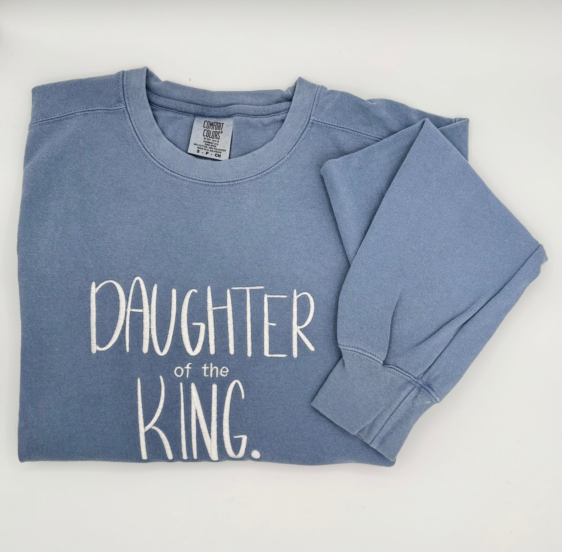 Soft, relaxed, and full of purpose — this vintage blue sweatshirt features “Daughter of the King” embroidered in crisp white, a gentle reminder of your royal identity in Christ.