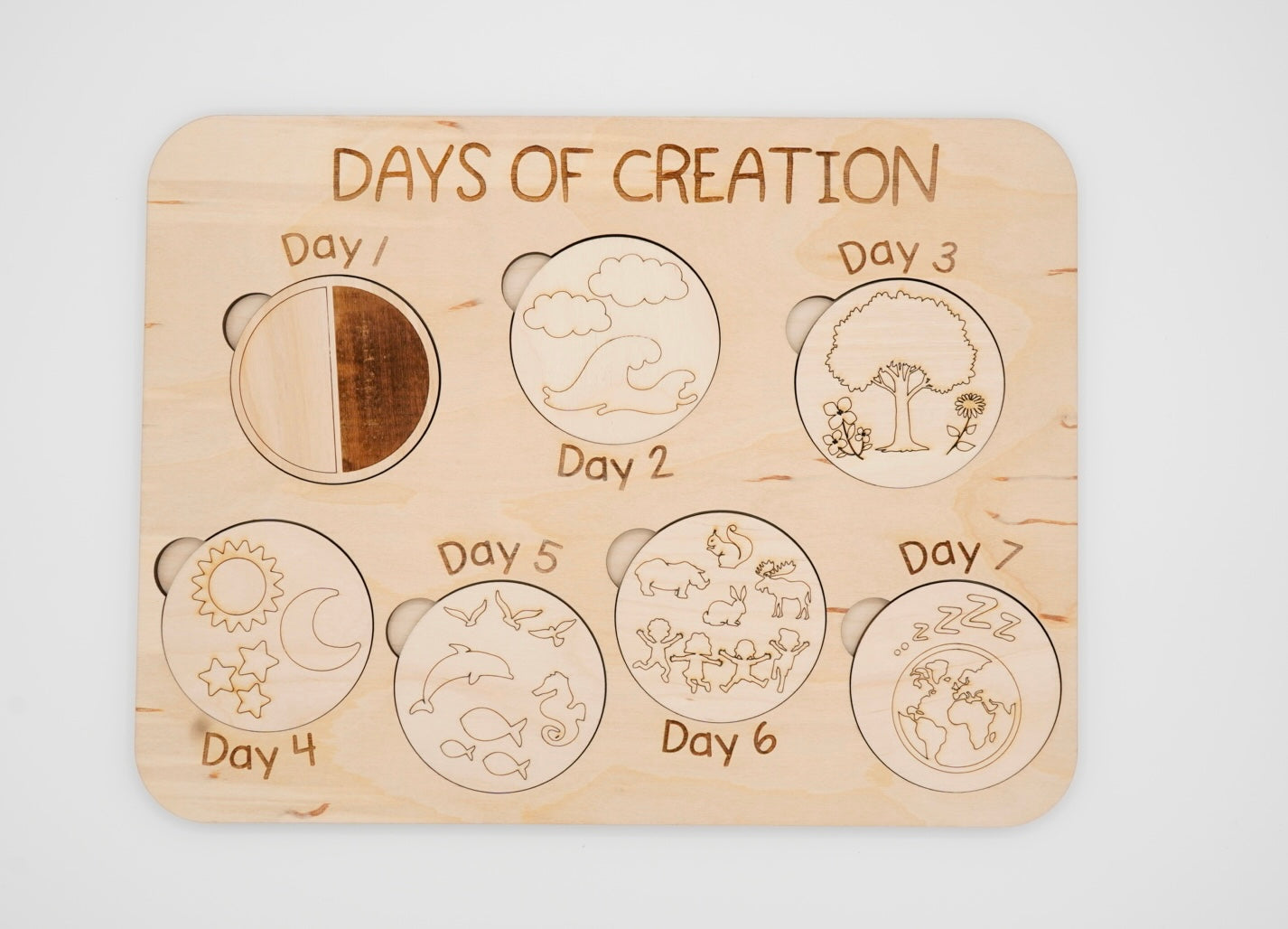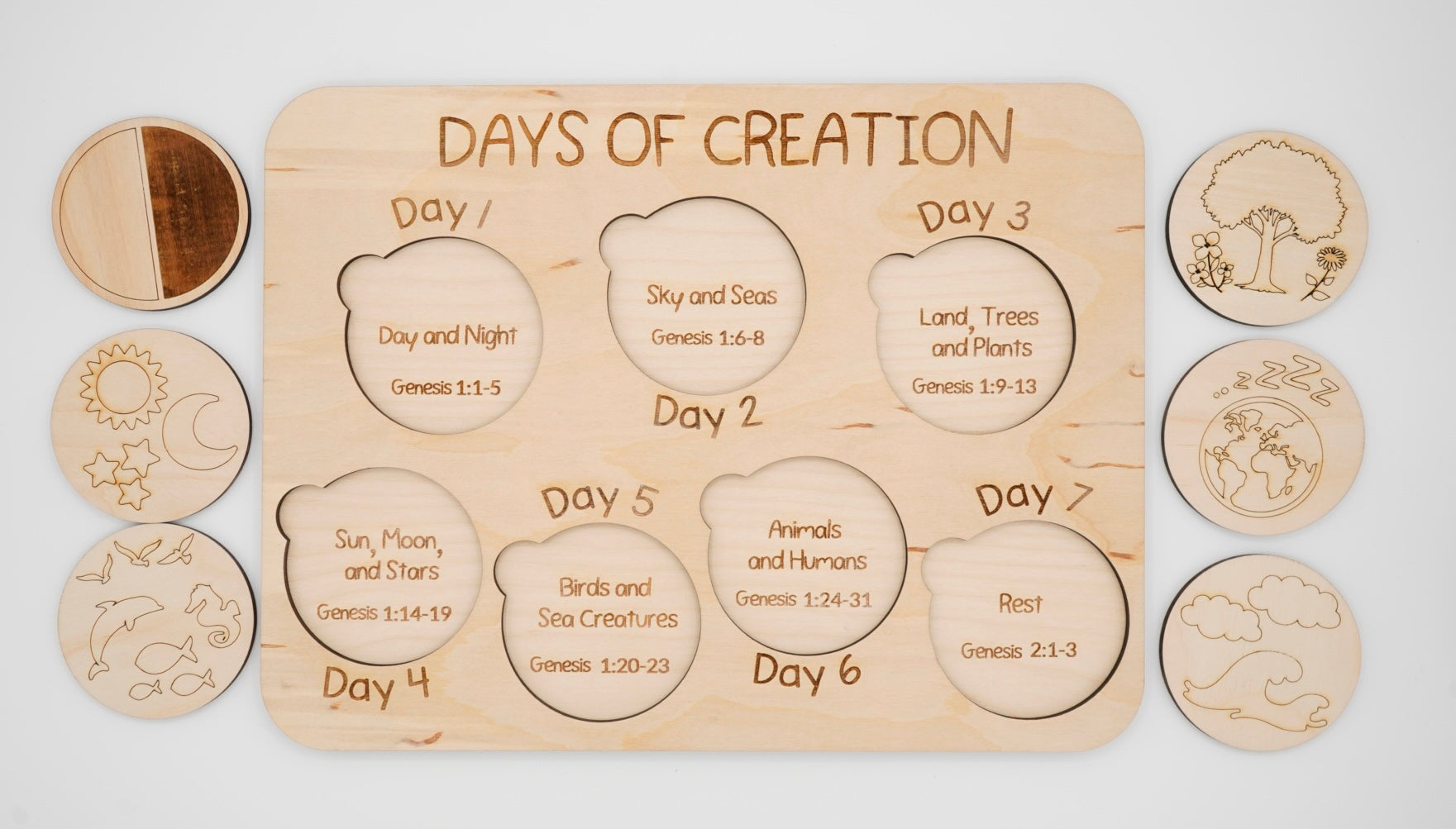 Teach kids the story of creation in a hands-on, meaningful way with the Days of Creation Puzzle. This birch wood puzzle features 7 pieces, each representing a day in the biblical creation story. On top, you’ll find an illustration of that day — and underneath, a clear description of what God created.