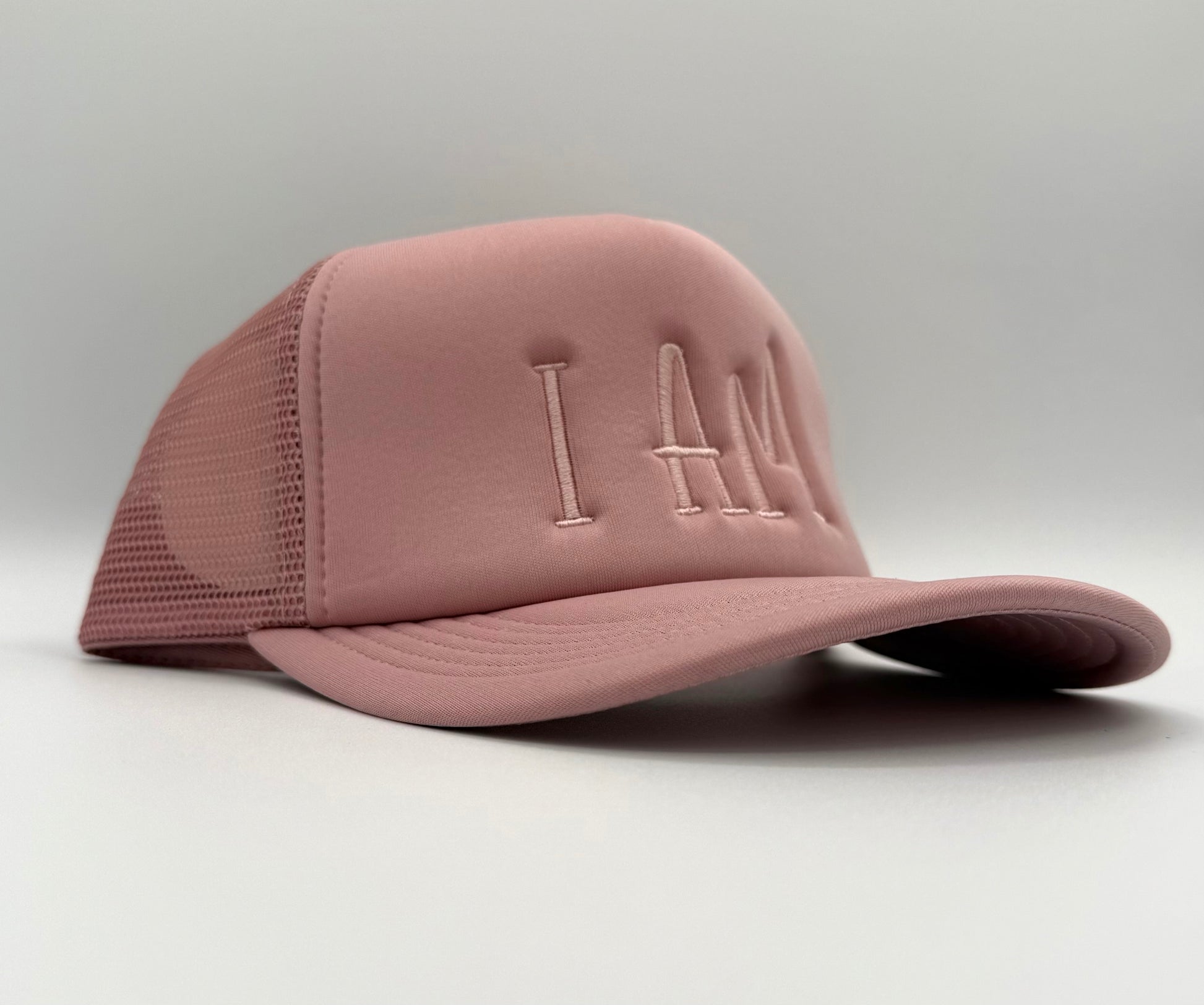 This rose pink foam trucker hat features the powerful declaration “I AM” embroidered in matching pink thread for a sleek, tone-on-tone look. Lightweight foam front, breathable mesh back, and adjustable snapback closure make it a go-to for everyday confidence.