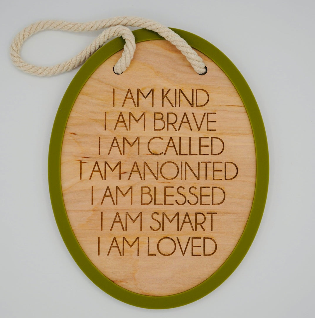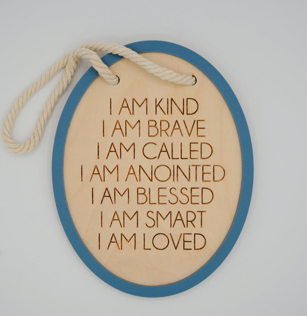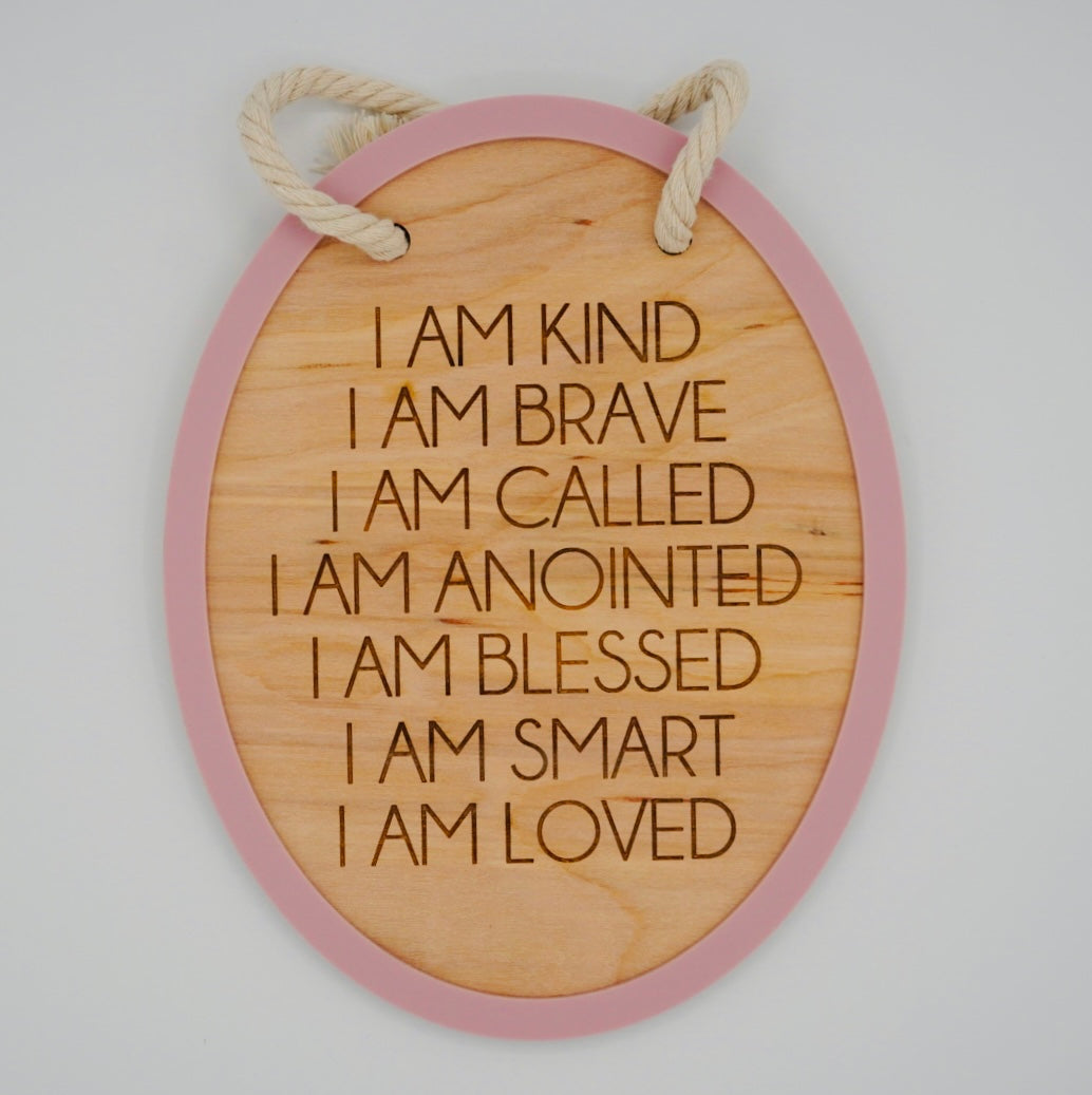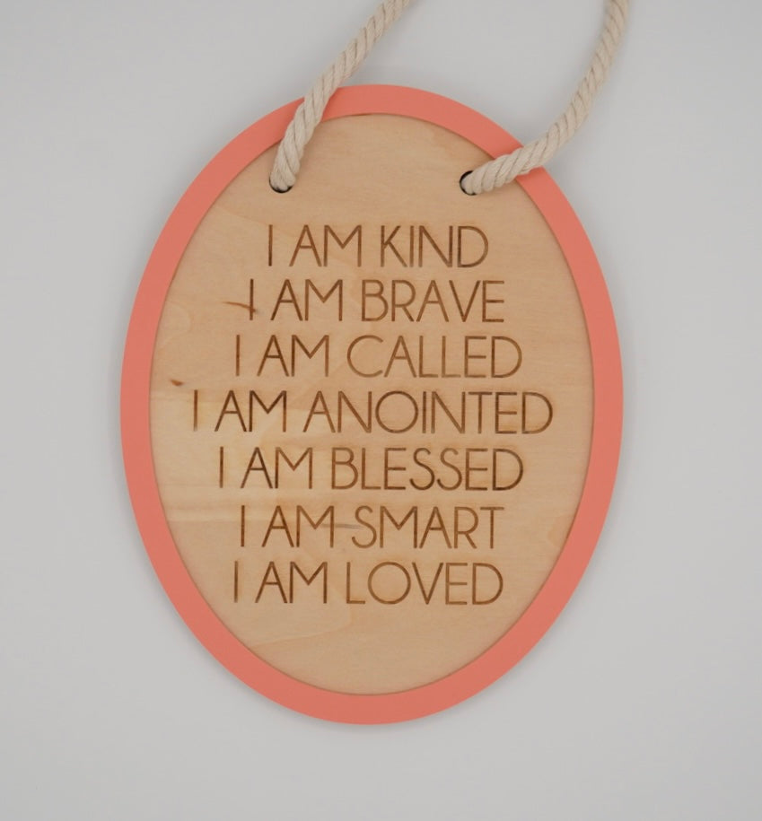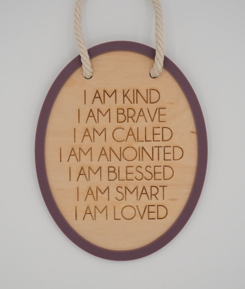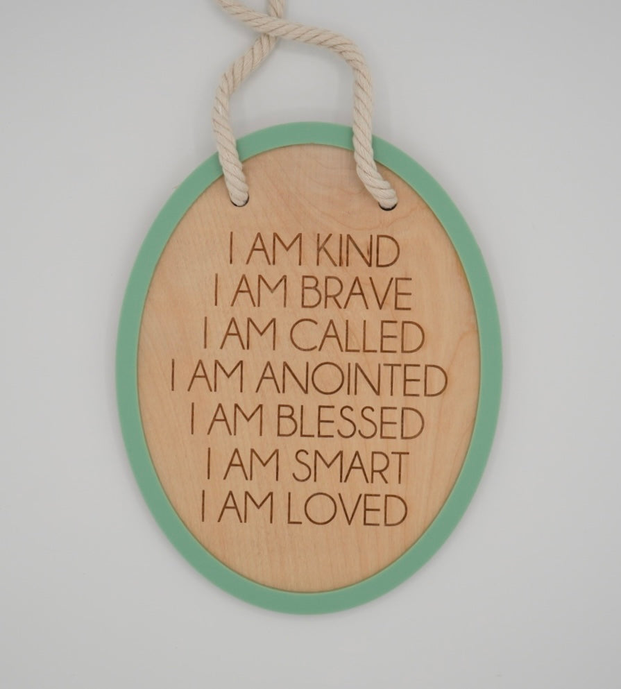 This beautiful oval birch wood sign is a daily reminder of identity and truth in Christ. Featuring a sleek acrylic border and precision engraving, it’s the perfect addition to a nursery, bedroom, prayer corner, or classroom.