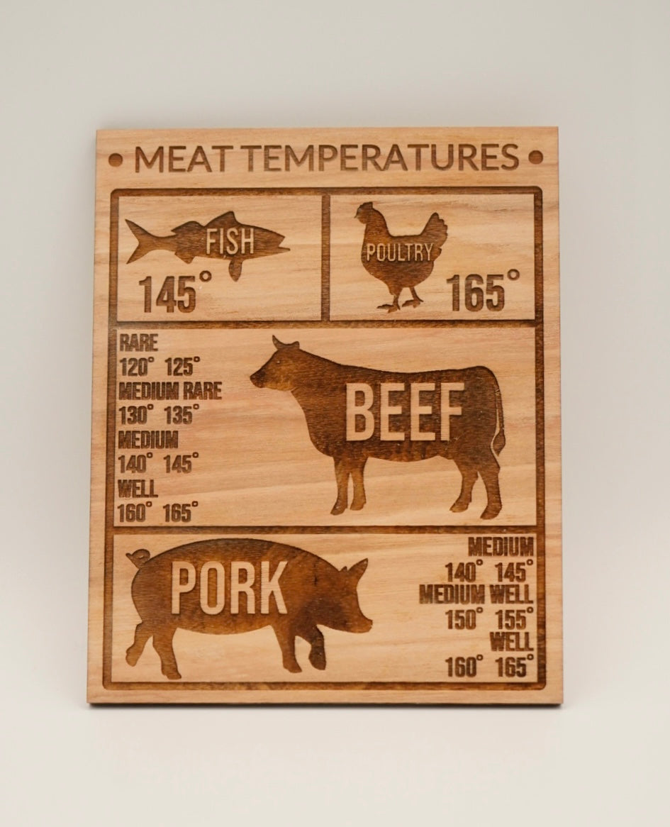 Never second-guess your cooking again! This beautifully engraved magnet displays the safe internal temperatures for fish, poultry, beef, and pork—making it the perfect quick reference while you’re grilling or in the kitchen.
