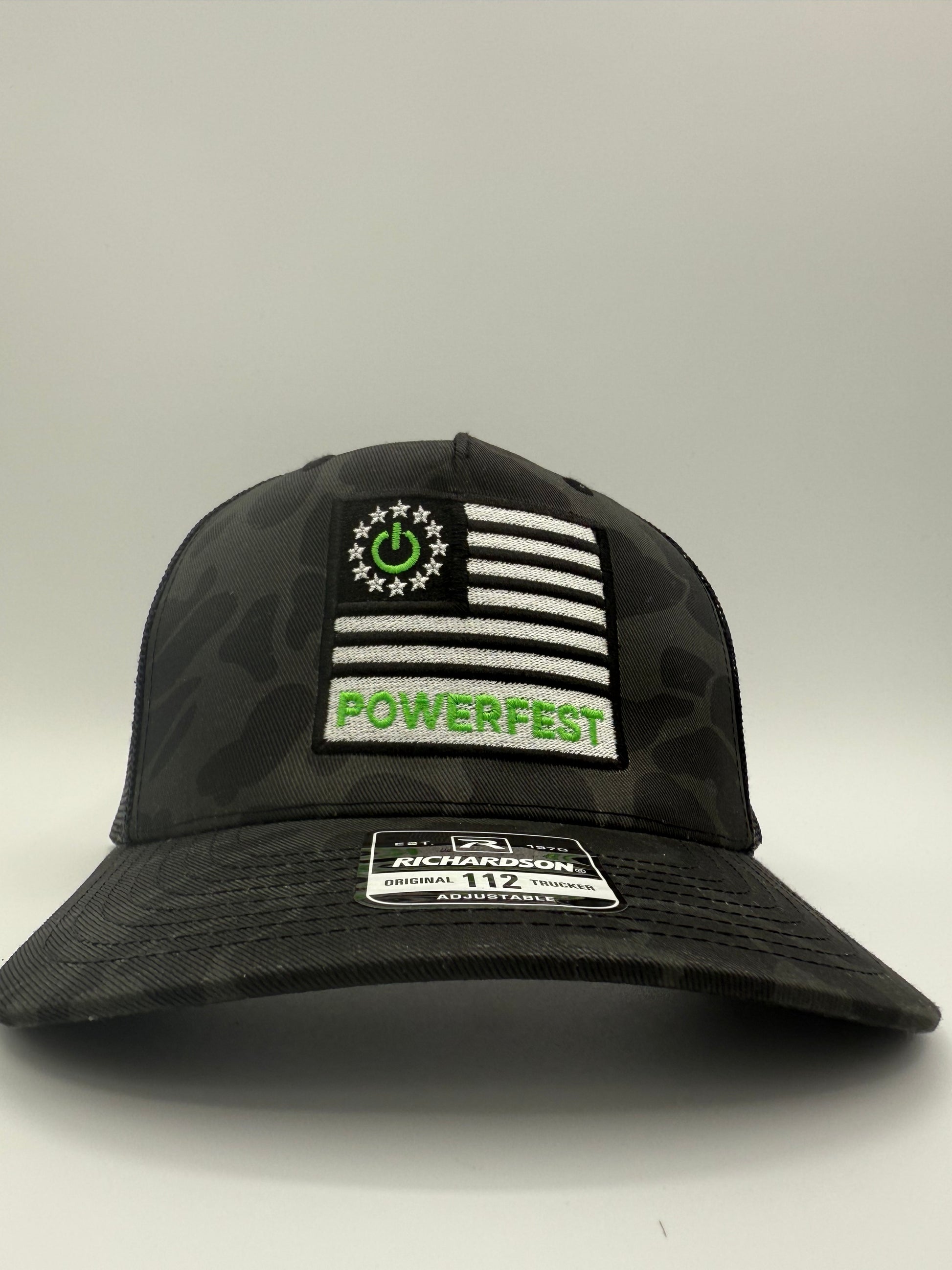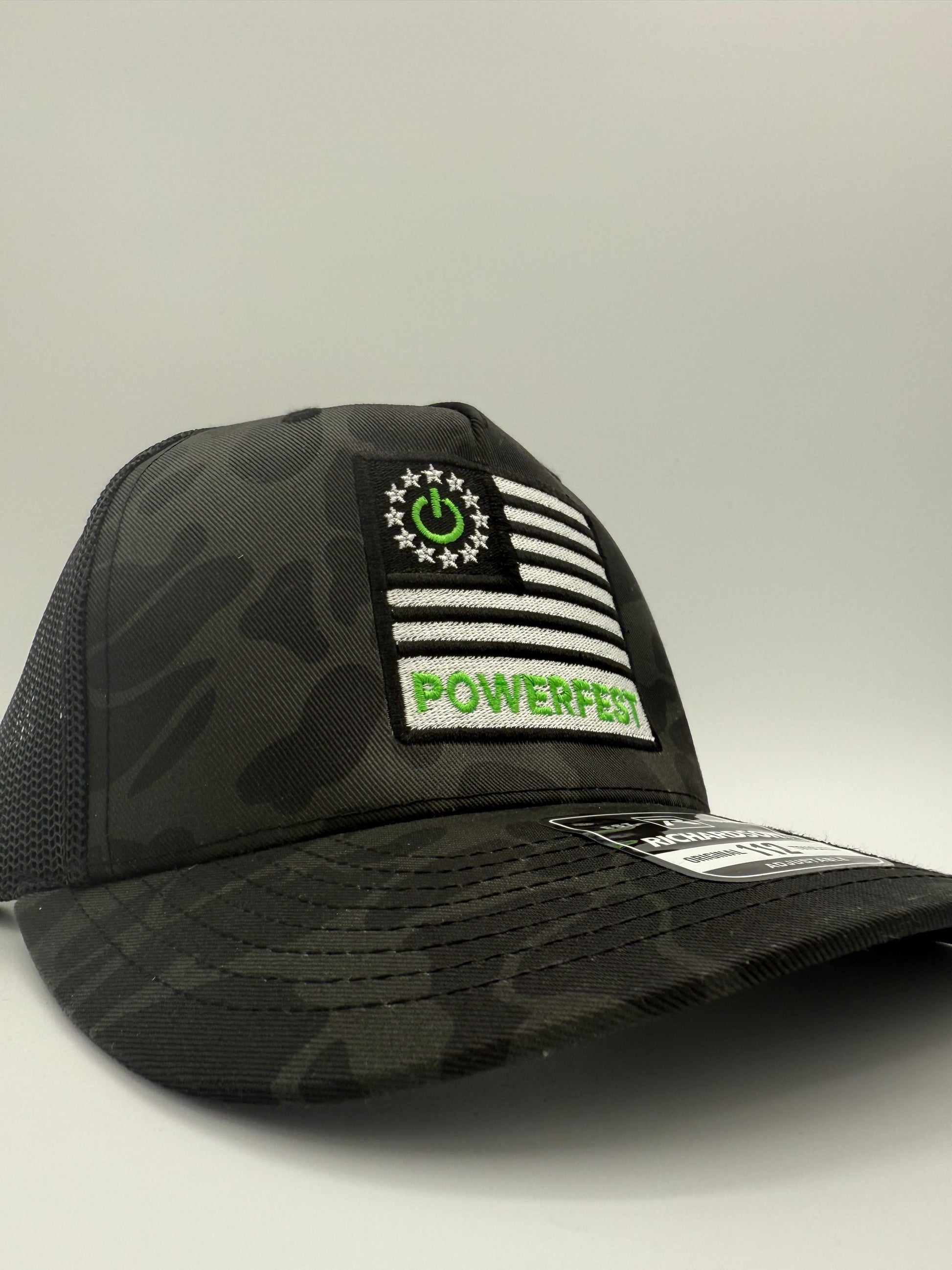 This Black Duck Camo hat features a black-and-white American flag with our signature green Power icon centered among the stars โ symbolizing strength, unity, and unwavering faith.