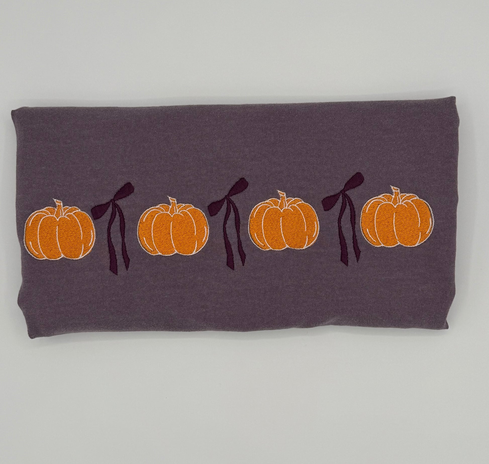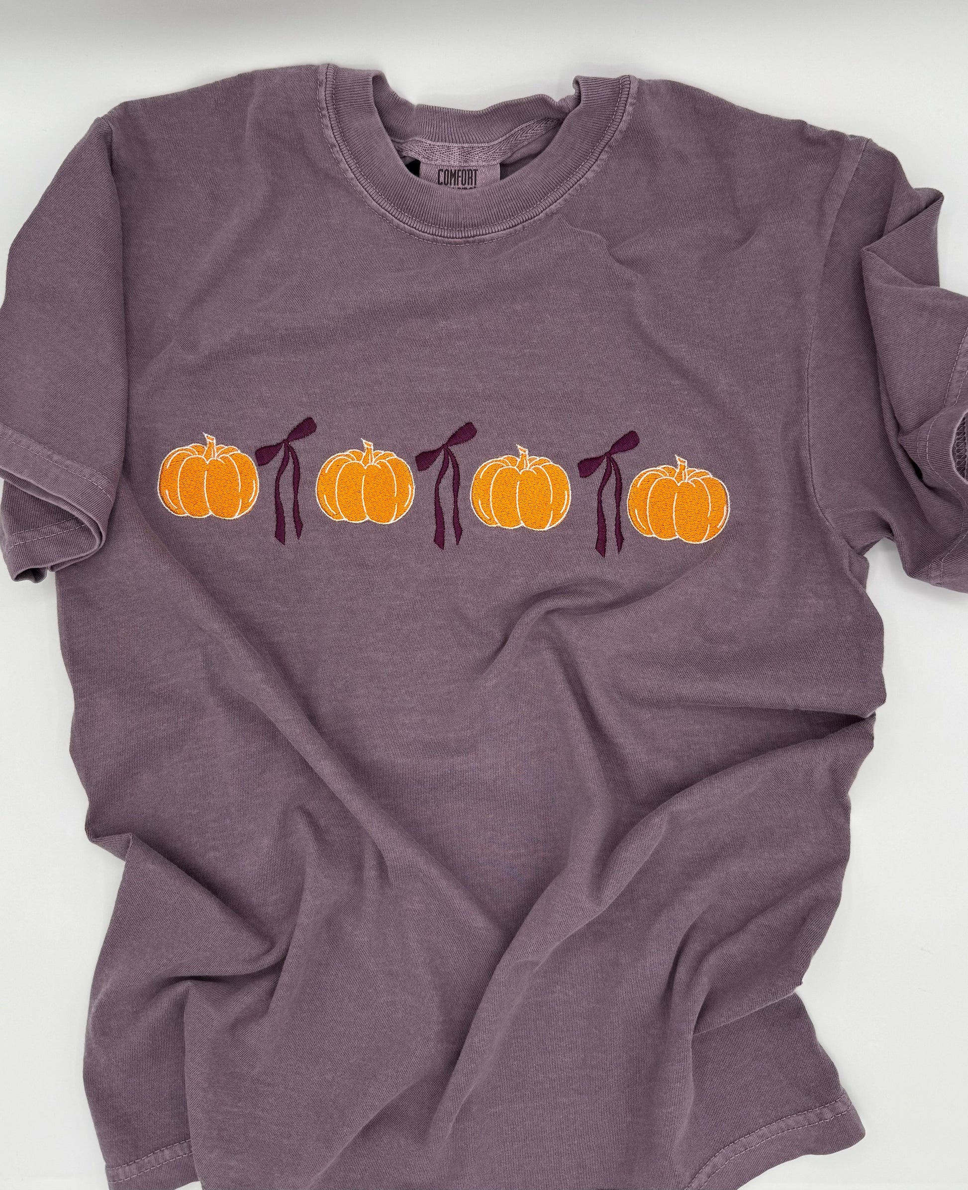 This soft, pigment-dyed purple tee brings a playful touch to your fall wardrobe. Featuring a row of alternating pumpkins and bows across the chest, itβs simple, seasonal, and effortlessly fun. Perfect for pumpkin patch days, cozy weekends, or layering under your favorite flannel.