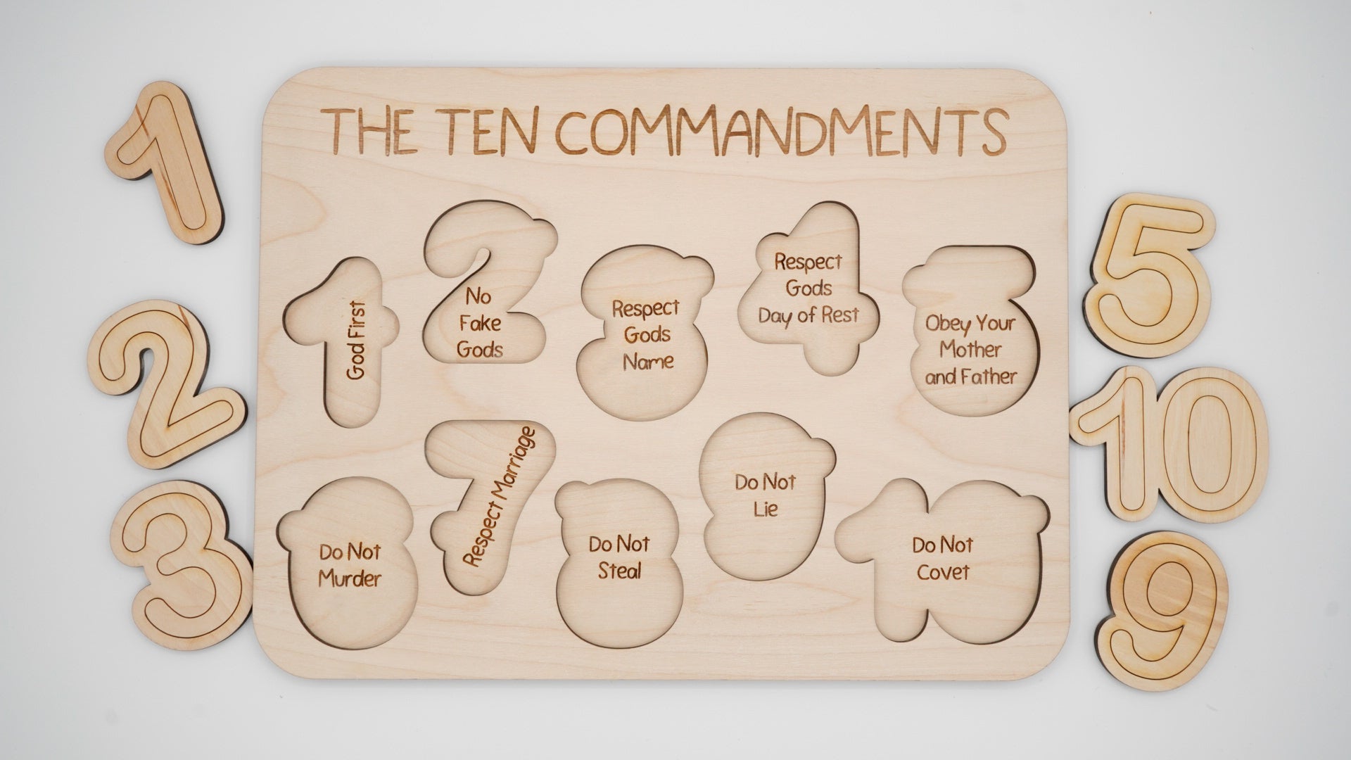 This 10 Commandments Wooden Puzzle is a meaningful way to teach both numbers 1–10 and the biblical Ten Commandments. Each number piece lifts to reveal the corresponding command underneath, combining spiritual learning with tactile play.