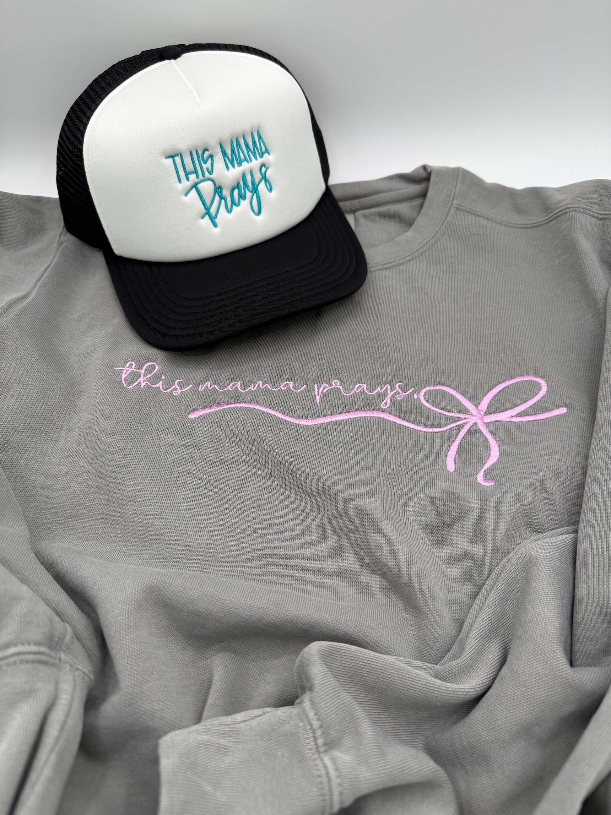 This set pairs our fan-favorite This Mama Prays trucker hat β white foam front with turquoise script and black mesh β with the cozy gray sweatshirt embroidered in soft lavender thread and finished with a delicate bow.
