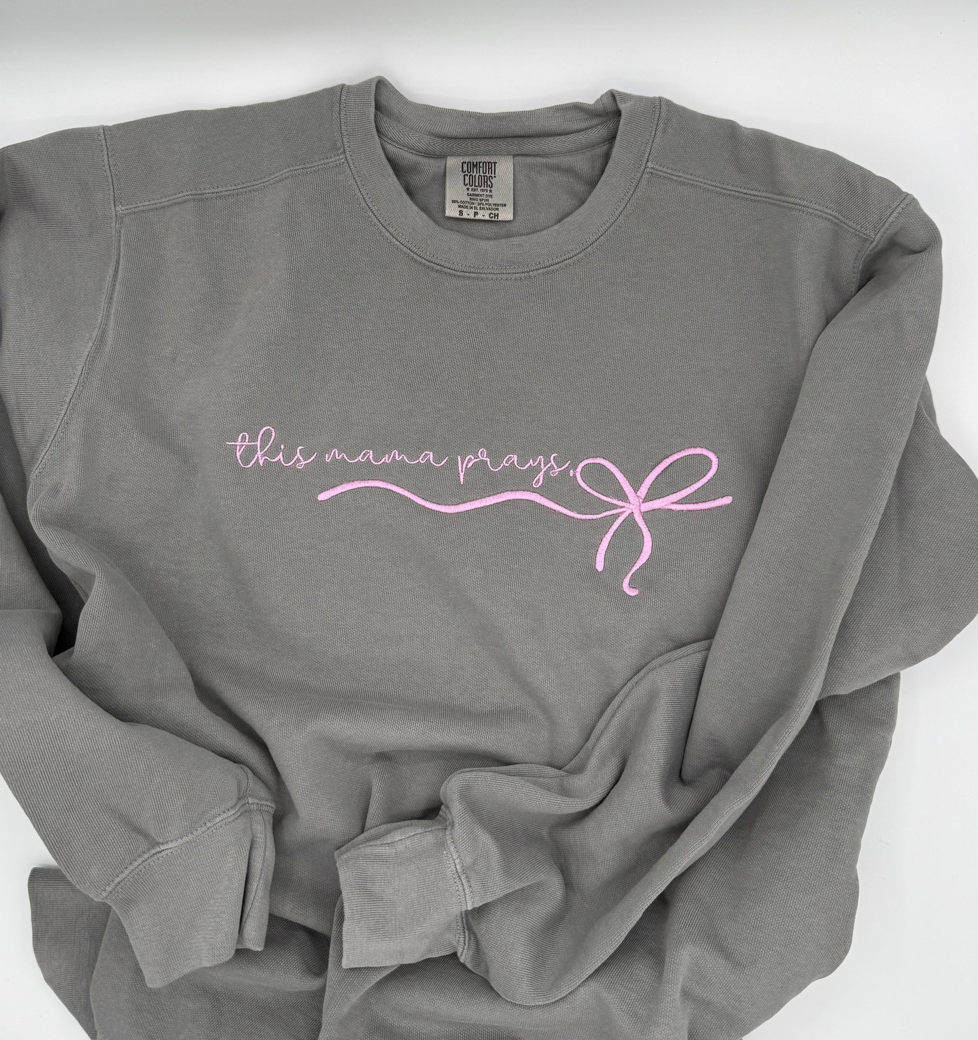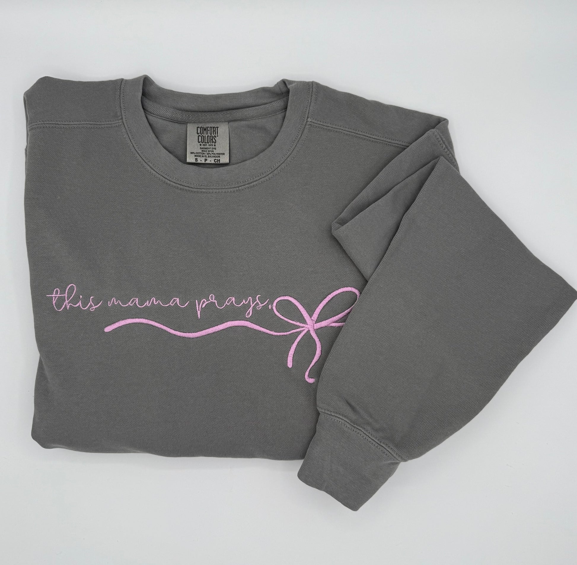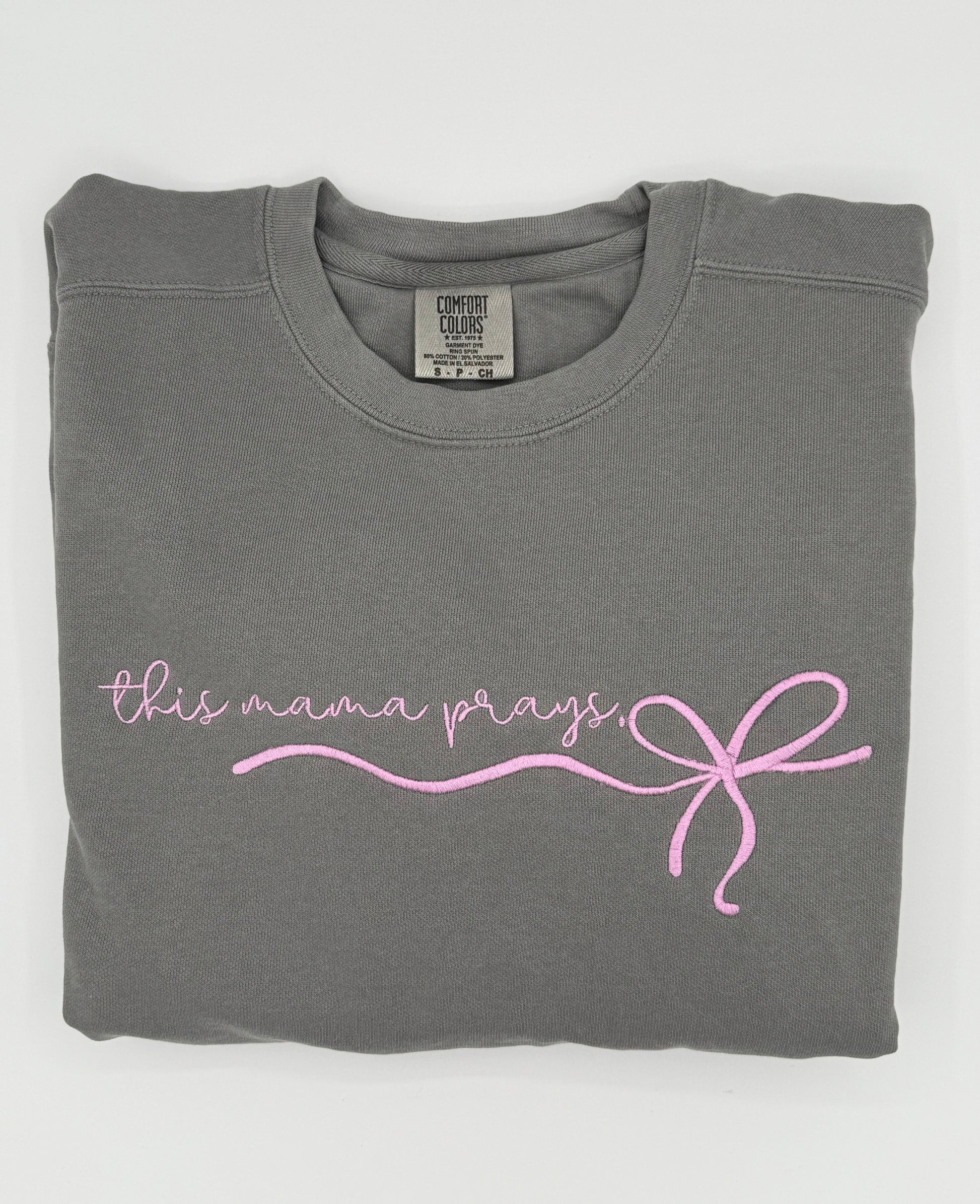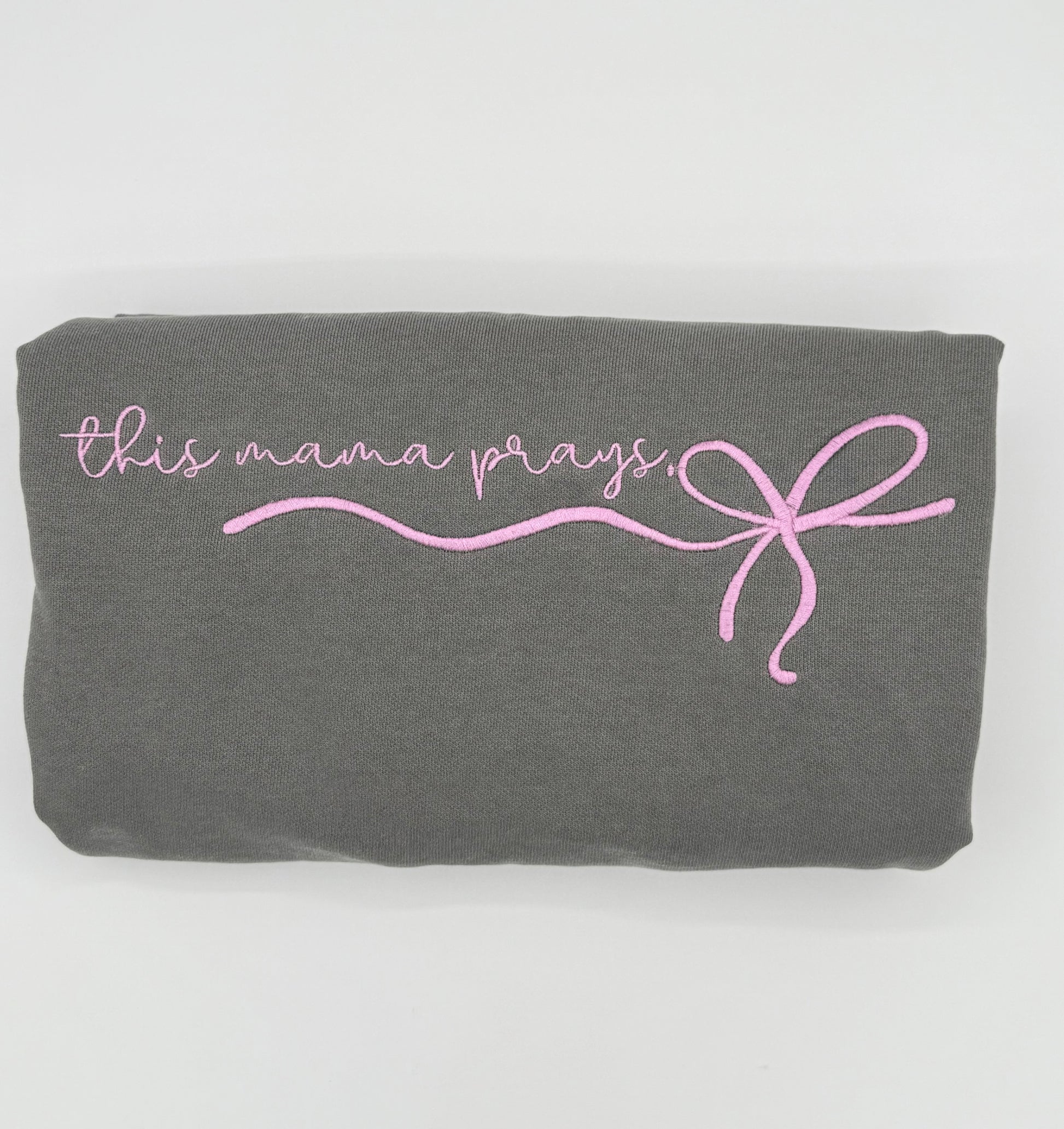 A cozy, lived-in feel from the very first wear — this soft gray sweatshirt features “this mama prays” embroidered in calming lavender, topped with a delicate bow for that gentle touch of grace.